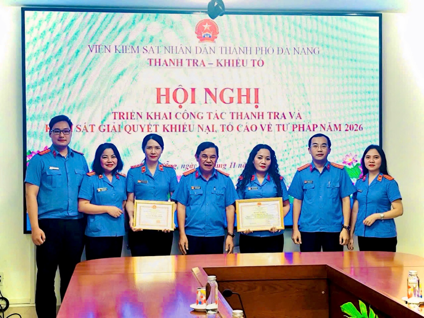 Trong năm 2025, Tập thể Thanh tra – Khiếu tố trên tinh thần đoàn kết, trách nhiệm, tận tụy với công việc đã kịp thời quán triệt, triển khai và thực hiện có hiệu quả Chỉ thị của Viện trưởng VKSND tối cao, Kế hoạch nhiệm vụ công tác của VKSND thành phố Đà Nẵng. Nhiều chỉ tiêu nhiệm vụ đạt và vượt so với năm 2024. Với những kết quả đạt được trong năm 2025, Thanh tra – Khiếu tố đã có 01 đồng chí được tặng danh hiệu Chiến sĩ thi đua cơ sở, 01 đồng chí nhận được Bằng khen của Viện trưởng VKSND tối cao, 01 đồng chí nhận được Giấy khen của Viện trưởng VKSND thành phố Đà Nẵng.