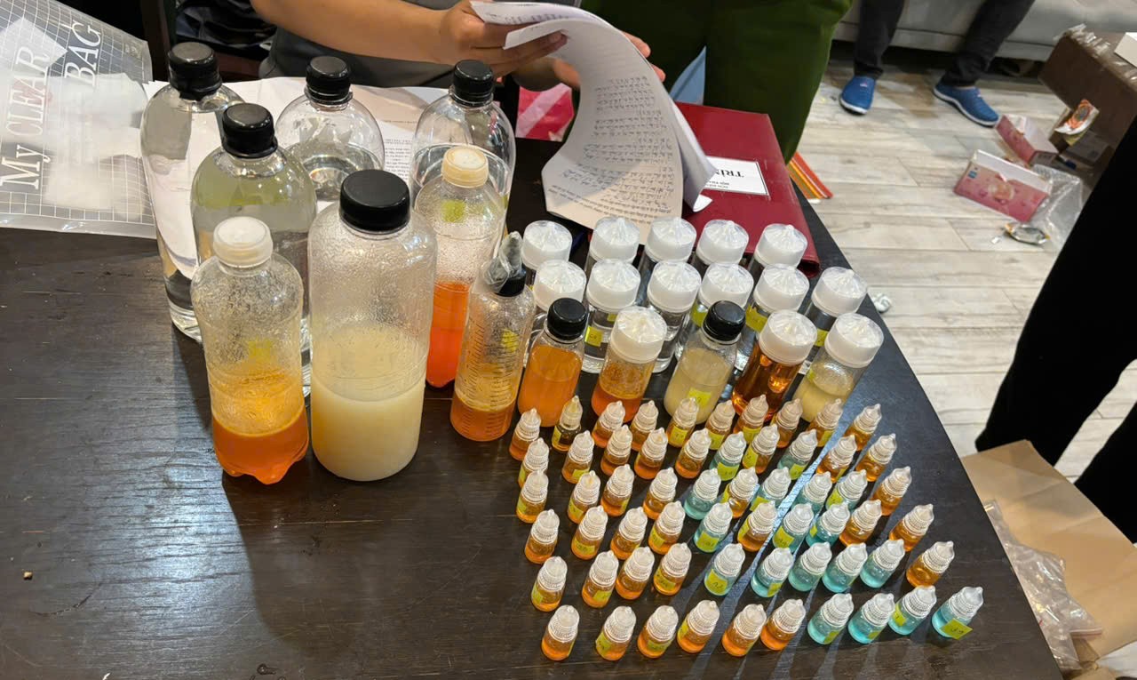 Hình ảnh 1: Nhiều lọ nhựa màu trắng chứa ma túy dạng tinh dầu CBD