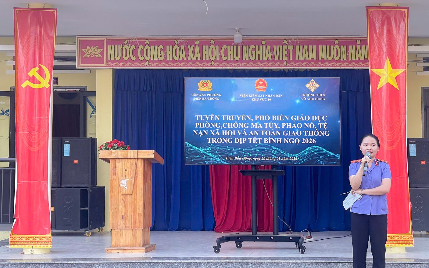 Chiều ngày 26/01/2026, Viện kiểm sát nhân dân khu vực 10 – thành phố Đà Nẵng đã tổ chức buổi tuyên truyền, phổ biến pháp luật về phòng, chống hành vi chế tạo, sản xuất, mua bán, tàng trữ và sử dụng pháo nổ tại Trường Trung học cơ sở Võ Như Hưng, thuộc Điện Bàn Đông, thành phố Đà Nẵng.