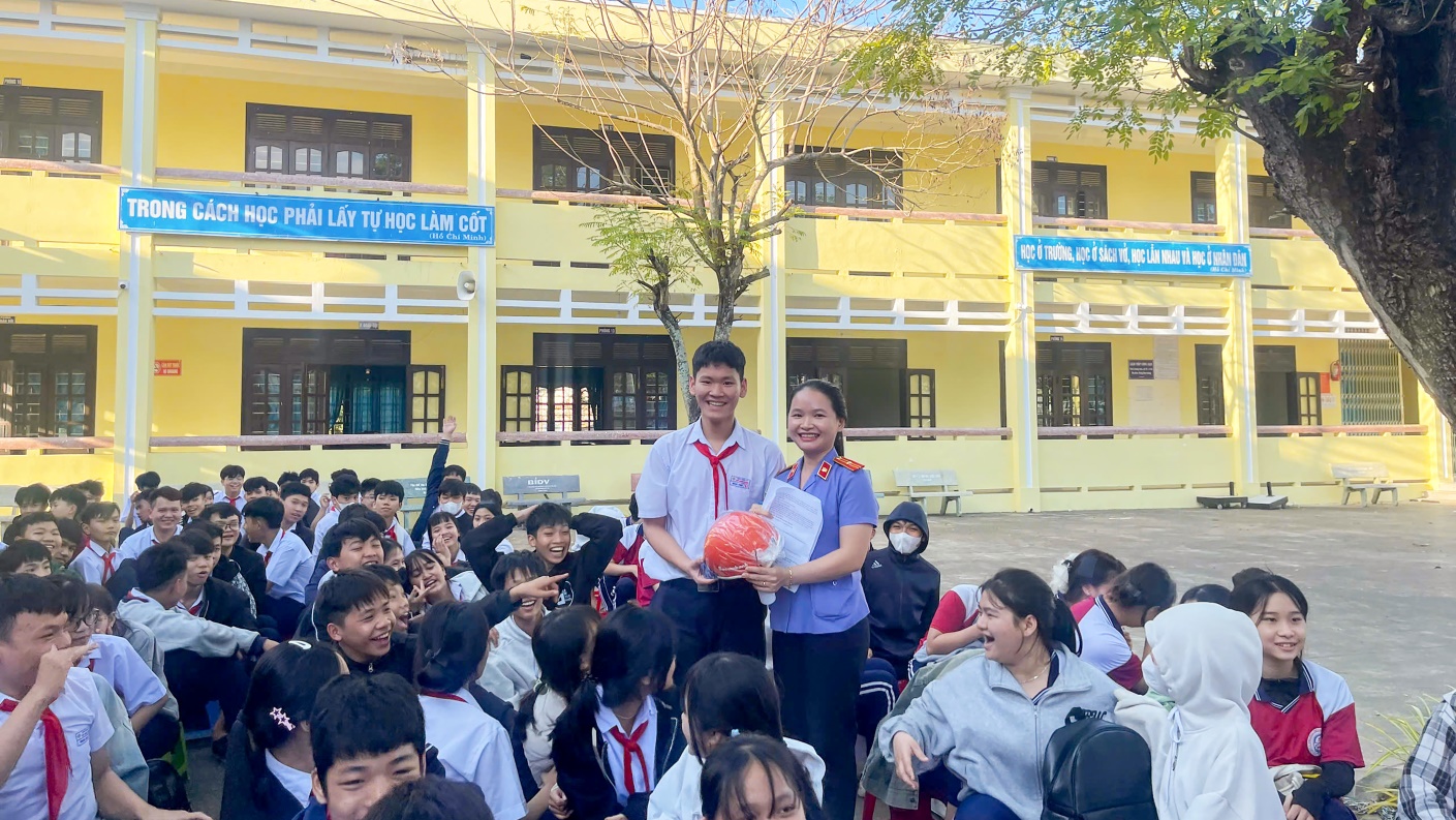 Buổi tuyên truyền còn được tổ chức theo hình thức giao lưu, hỏi – đáp sôi nổi. Nhiều học sinh đã tích cực tham gia trả lời các câu hỏi tình huống liên quan đến hành vi sử dụng, tàng trữ, chế tạo pháo nổ và hậu quả pháp lý có thể xảy ra. Thông qua phần giao lưu này, các em không chỉ củng cố kiến thức pháp luật mà còn rèn luyện kỹ năng nhận diện, phòng tránh vi phạm trong thực tế. Ban tổ chức cũng đã trao những phần quà nhỏ, ý nghĩa nhằm động viên tinh thần và khích lệ sự tham gia tích cực của các em học sinh.