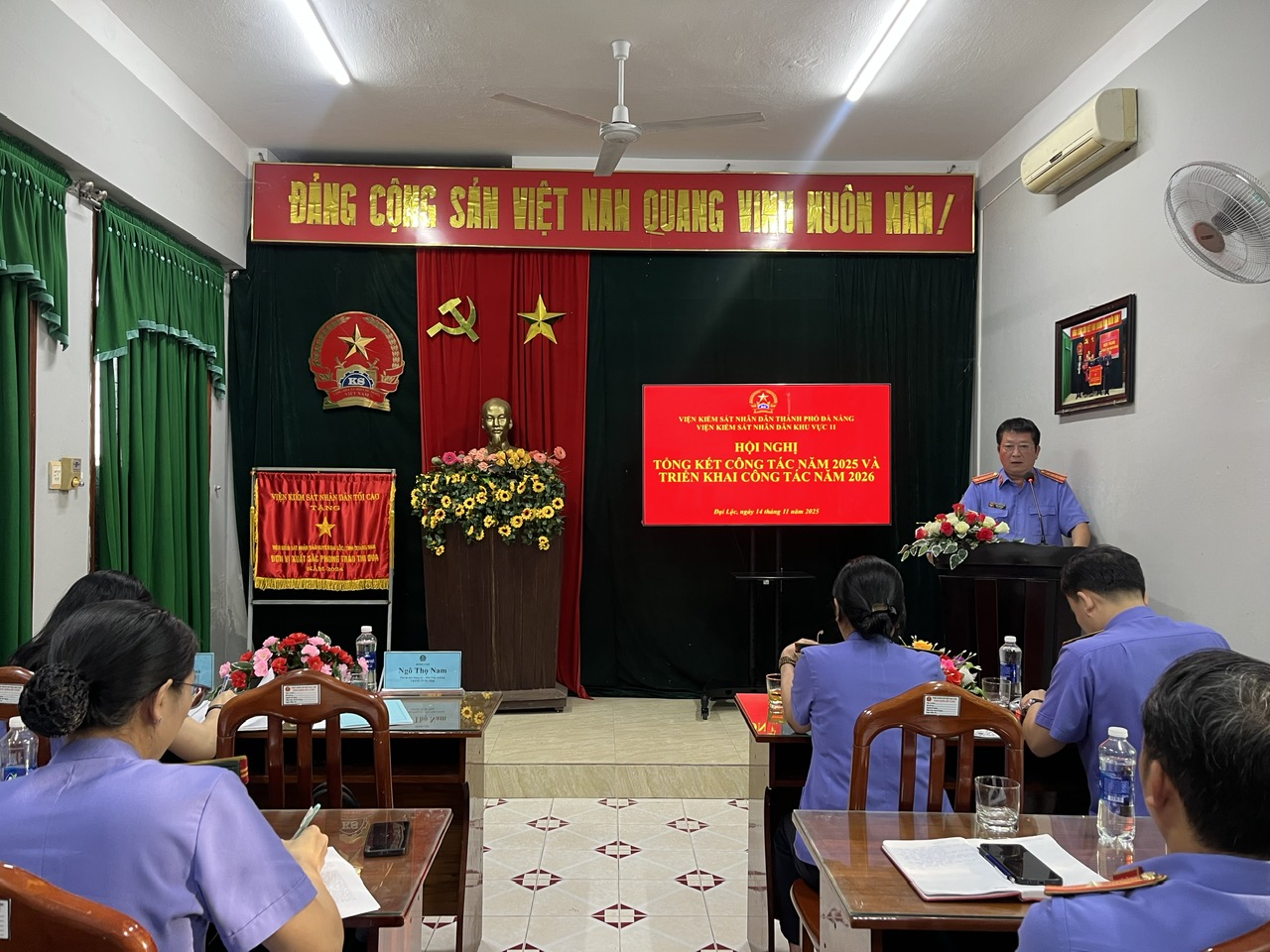 Phát biểu chỉ đạo Hội nghị, đồng chí Ngô Thọ Nam - Phó Viện trưởng VKSND thành phố Đà Nẵng đã ghi nhận và biểu dương những thành tích mà tập thể VKSND khu vực 11 đã đạt được trong năm 2025, đồng chí đề nghị đơn vị tiếp tục phát huy tinh thần đoàn kết, nỗ lực phấn đấu, phối hợp chặt chẽ với các cơ quan tiến hành tố tụng theo yêu cầu “Sớm hơn, sát hơn, sâu hơn, sắc hơn”, chủ động triển khai thí điểm khởi kiện vụ án dân sự công ích theo Nghị quyết số 205/2025/QH15, đồng thời tăng cường ứng dụng công nghệ thông tin, chuyển đổi số trong công tác kiểm sát, đáp ứng yêu cầu nhiệm vụ trong tình hình mới.