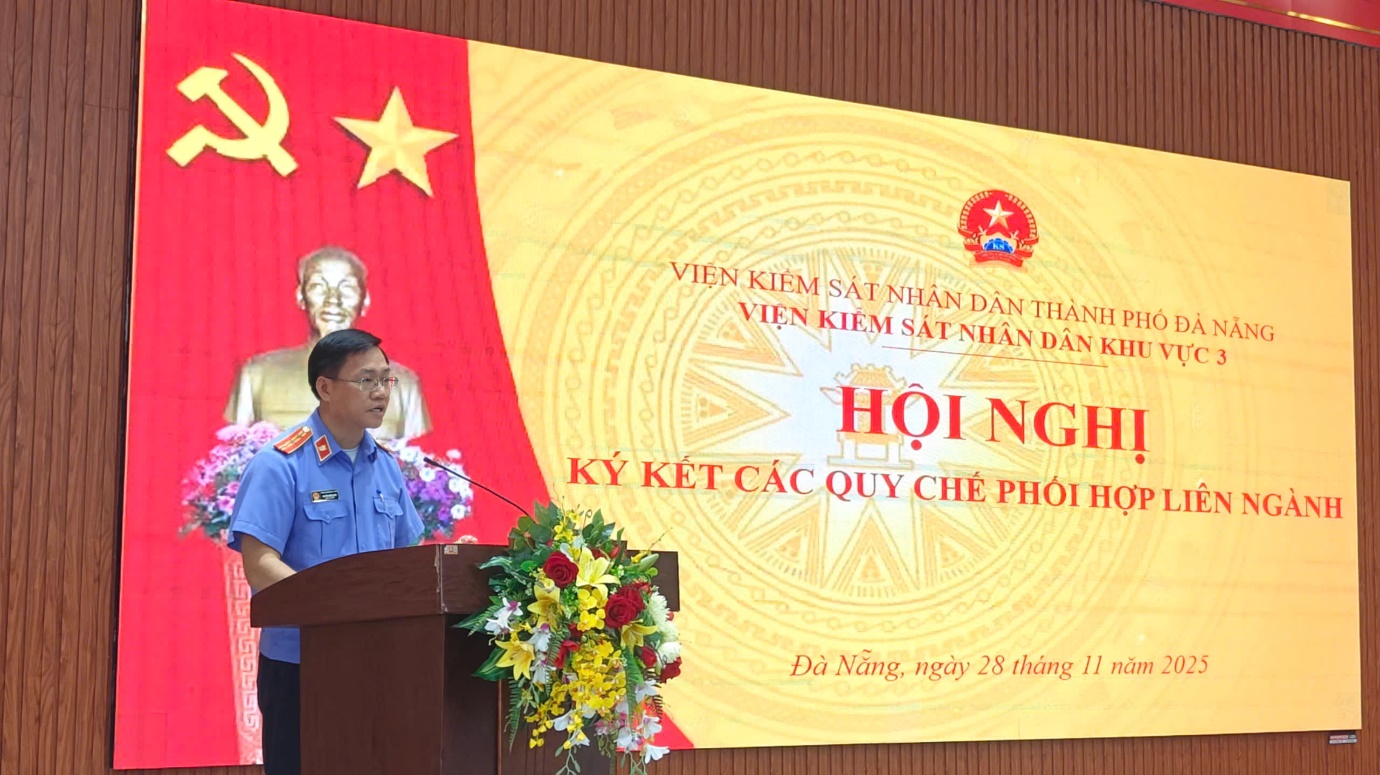 Phát biểu chỉ đạo tại Hội nghị, đồng chí Ngô Thọ Nam – Phó Bí thư Đảng uỷ, Phó Viện trưởng VKSND thành phố Đà Nẵng đánh giá cao sự chủ động của VKSND khu vực 3 trong việc xây dựng, hoàn thiện các Quy chế phối hợp; nhấn mạnh tầm quan trọng của việc xây dựng cơ chế phối hợp rõ ràng, thống nhất và kịp thời giữa các cơ quan liên quan, đặc biệt trong bối cảnh thực hiện chủ trương sắp xếp, tinh gọn tổ chức bộ máy. Bên cạnh đó, việc triển khai thực hiện Nghị quyết số 205/QH/2025 ngày 24/6/2025 của Quốc hội về khởi kiện vụ án dân sự công ích là một nhiệm vụ chính trị mới hết sức quan trọng, đòi hỏi sự chuẩn bị kỹ lưỡng và chủ động của các cơ quan chức năng, không chỉ là trách nhiệm của riêng ngành Kiểm sát. Từ đó yêu cầu các cơ quan liên ngành tập trung thực hiện một số nhiệm vụ trọng tâm trong thời gian đến để tổ chức thực hiện hiệu quả nhiệm vụ mới này, đảm bảo đúng pháp luật và phù hợp với thực tiễn.