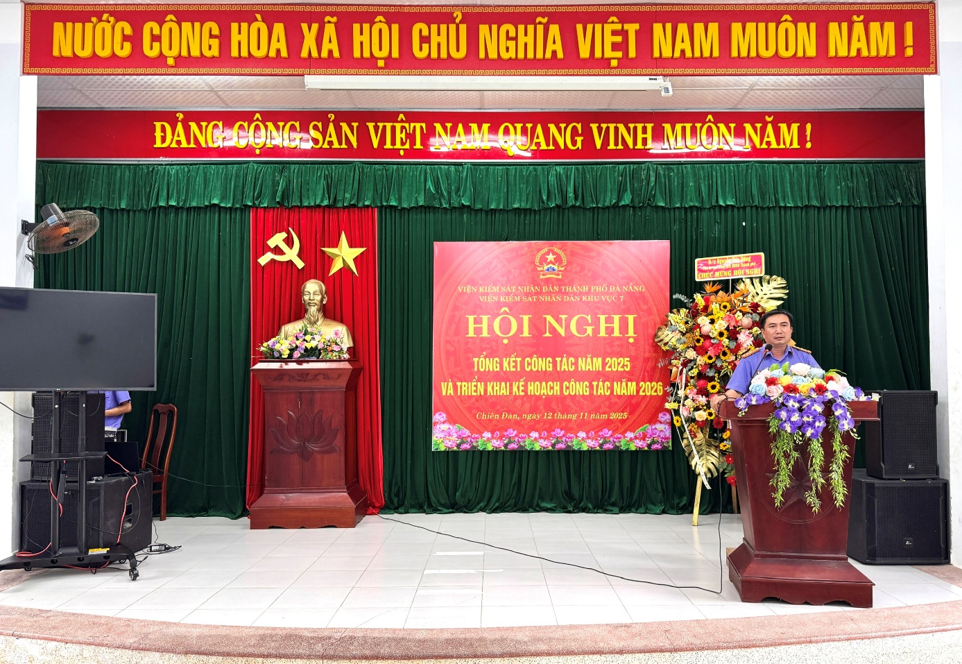 Phát biểu chỉ đạo Hội nghị, đồng chí Nguyễn Hữu Khoa - Ủy viên Ban Thường vụ Đảng ủy Phó Phó Viện trưởng VKSND thành phố Đà Nẵng ghi nhận, biểu dương những kết quả đạt được của VKSND Khu vực 7 trong thực hiện nhiệm vụ năm 2025; đồng thời, đề nghị đơn vị tiếp tục phát huy những thành tích đã đạt được, khắc phục các tồn tại, hạn chế nhằm thực hiện đạt và vượt các chỉ tiêu, kế hoạch công tác đã đề ra, đáp ứng yêu cầu của Ngành và phục vụ tốt nhiệm vụ chính trị của địa phương.