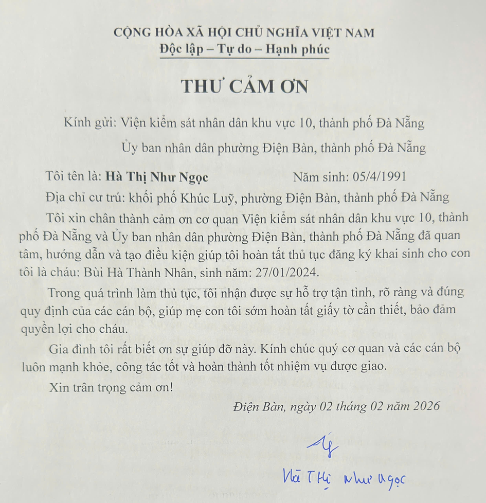 Ngày 20/01/2026, VKSND khu vực 10 – Đà Nẵng tiếp nhận thông tin vụ việc dân sự công ích thông qua đơn đề nghị trợ giúp của chị Hà Thị Như Ngọc (sinh năm 1991), trú tại khối phố Khúc Luỹ, phường Điện Bàn, thành phố Đà Nẵng.
