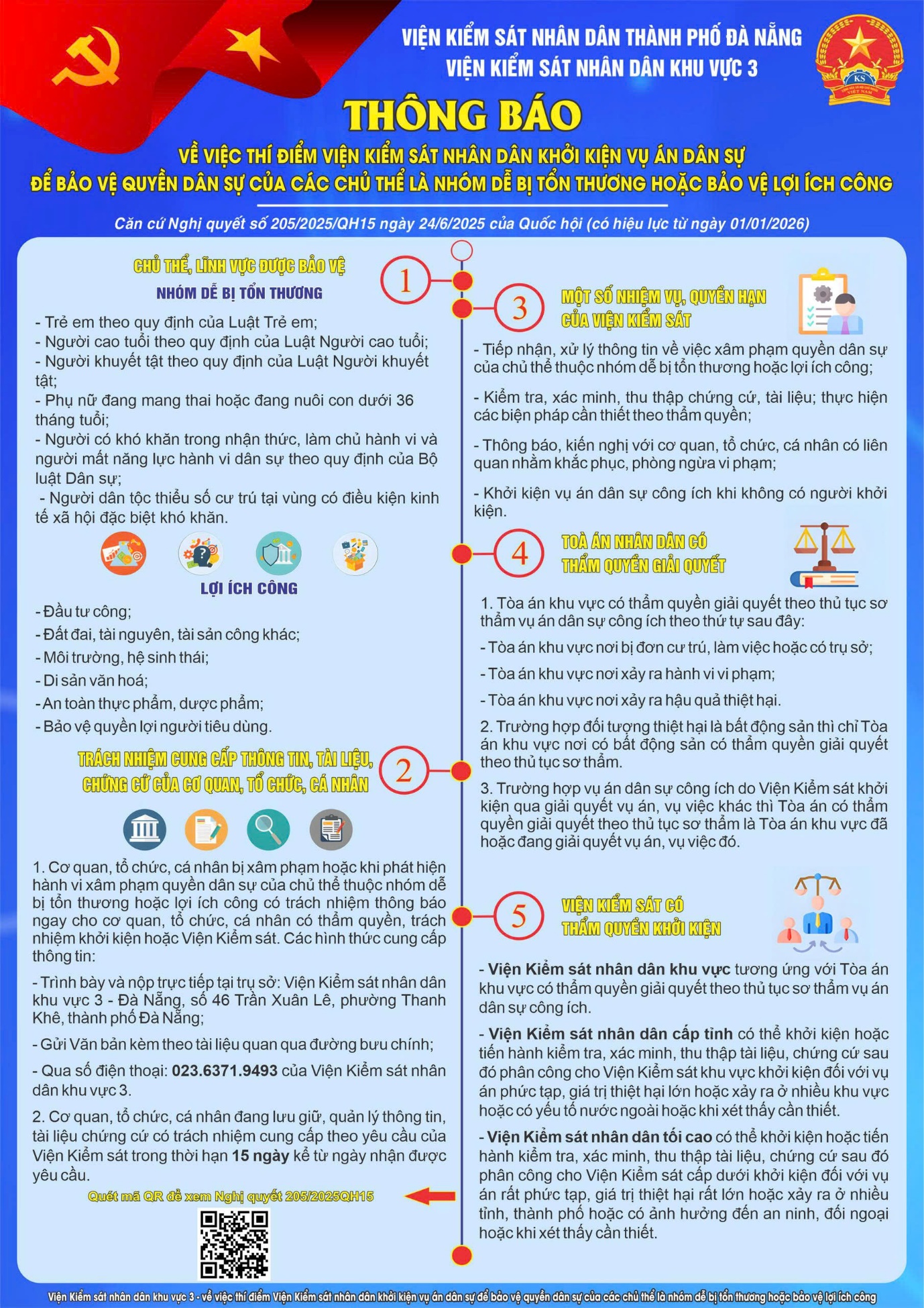 Thực hiện chỉ đạo của Viện Kiểm sát nhân dân (VKSND) thành phố Đà Nẵng về việc đẩy mạnh công tác tuyên truyền, phổ biến Nghị quyết số 205/2025/QH15 của Quốc hội về thí điểm Viện kiểm sát nhân dân khởi kiện vụ án dân sự để bảo vệ quyền dân sự của nhóm dễ bị tổn thương và bảo vệ lợi ích công (Nghị quyết 205), VKSND khu vực 3 - Đà Nẵng đã chủ động xây dựng kế hoạch, phối hợp với 15 cơ quan liên ngành triển khai đồng loạt việc lắp đặt Bảng thông tin tuyên truyền trên địa bàn các phường Thanh Khê, An Khê, Cẩm Lệ, thành phố Đà Nẵng