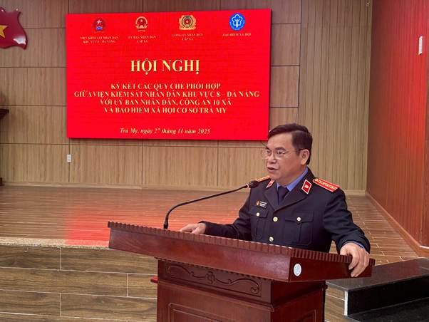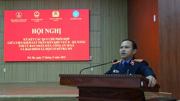 Vào chiều ngày 27/11/2025, Viện kiểm sát nhân dân khu vực 8 thành phố Đà Nẵng đã tổ chức Hội nghị ký kết Quy chế phối hợp với Ủy ban nhân dân (UBND), Công an các xã trên địa bàn và Bảo hiểm xã hội cơ sở Trà My. Buổi lễ được chủ trì bởi đồng chí Hồ Thanh Vấn - Viện trưởng VKSND khu vực 8, nhằm thiết lập cơ chế hợp tác chặt chẽ giữa các cơ quan trong công tác phòng, chống tội phạm, bảo vệ công lý, bảo vệ quyền lợi của cộng đồng và đảm bảo quyền lợi bảo hiểm xã hội cho người dân.