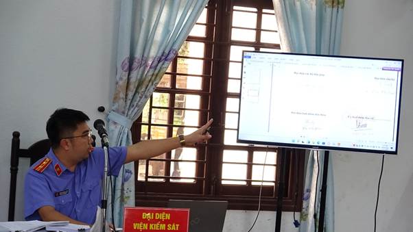Kiểm sát viên trình chiếu chứng cứ tại phiên tòa