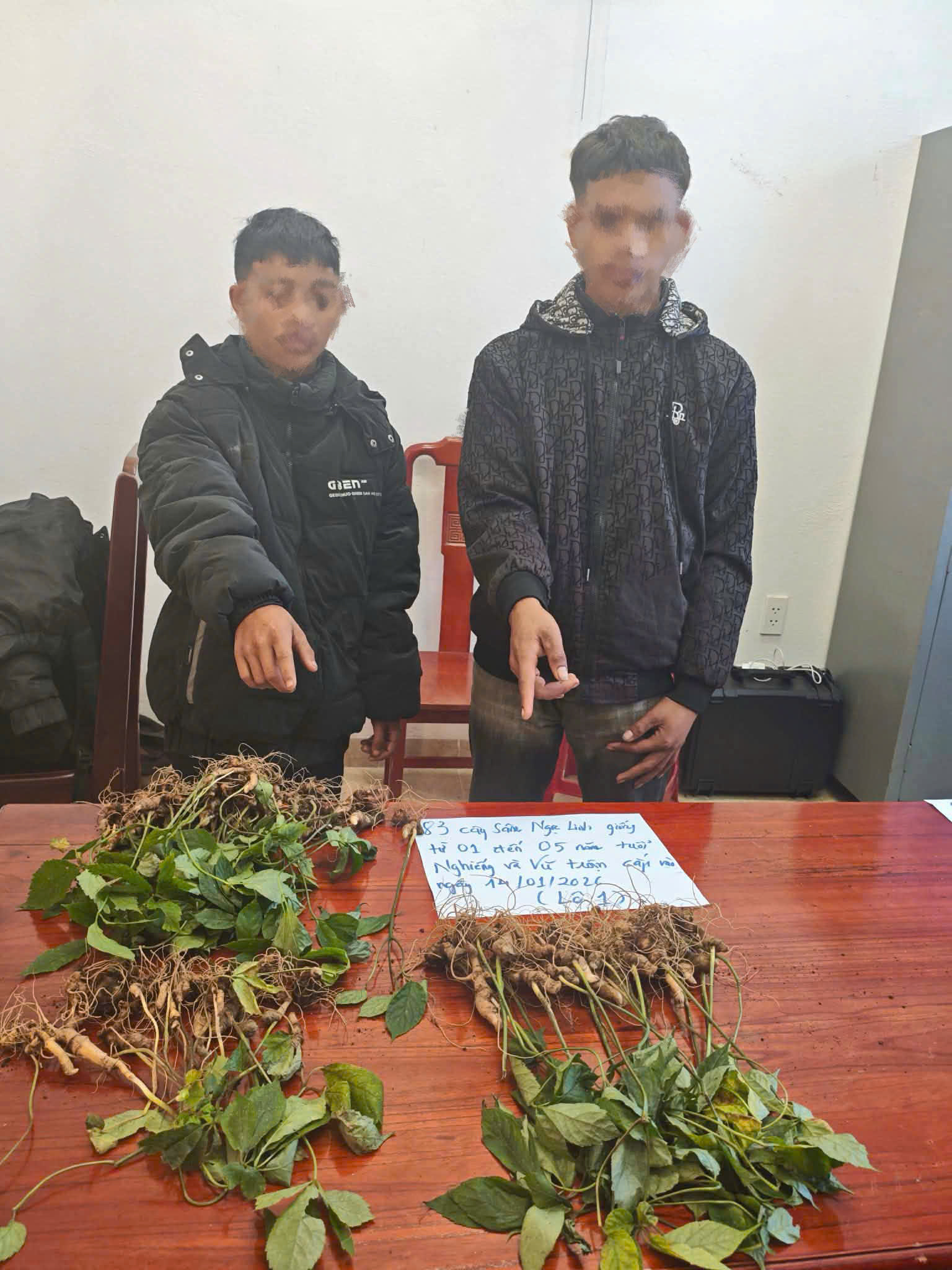 Quá trình làm việc, các đối tượng đã khai nhận việc tiến hành đột nhập và nhổ tổng cộng 100 gốc Sâm Ngọc Linh có độ tuổi từ 01 đến 05 năm. Trong đó, lần 01 vào ngày 11/01/2026 cả hai đã dùng tay nhổ trộm 17 (Mười bảy) cây Sâm giống và số sâm này đã được các đối tượng bán để lấy tiền tiêu sài. Lần 02 vào sáng ngày 14/01/2026, Nghiếng và V tiếp tục nhổ trộm được tổng cộng 83 gốc Sâm Ngọc Linh, các đối tượng chưa bán được số sâm trên thì bị Cơ quan Công an phát hiện và mời làm việc.