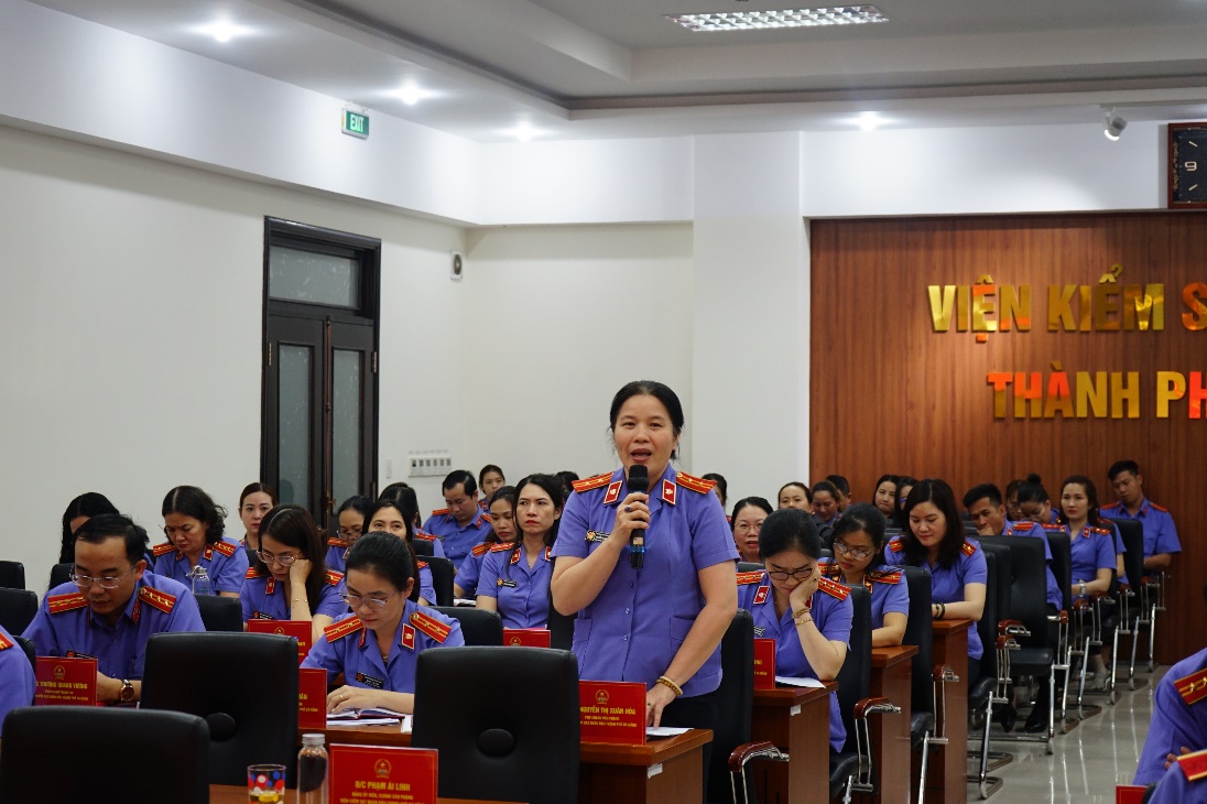 Đồng chí Nguyễn Thị Xuân Hòa, Phó Chánh Văn phòng VKSND thành phố phát biểu tại Hội nghị