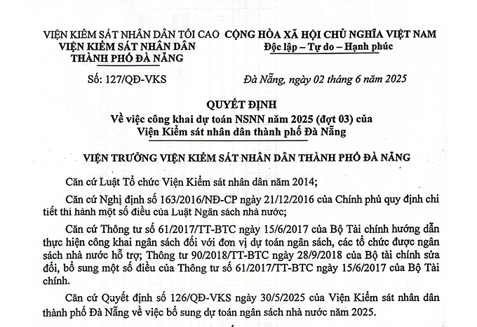 QUYẾT ĐỊNH về việc công khai dự toán NSNN năm 2025 (đợt 03) của Viện Kiểm sát nhân dân thành phố Đà Nẵng