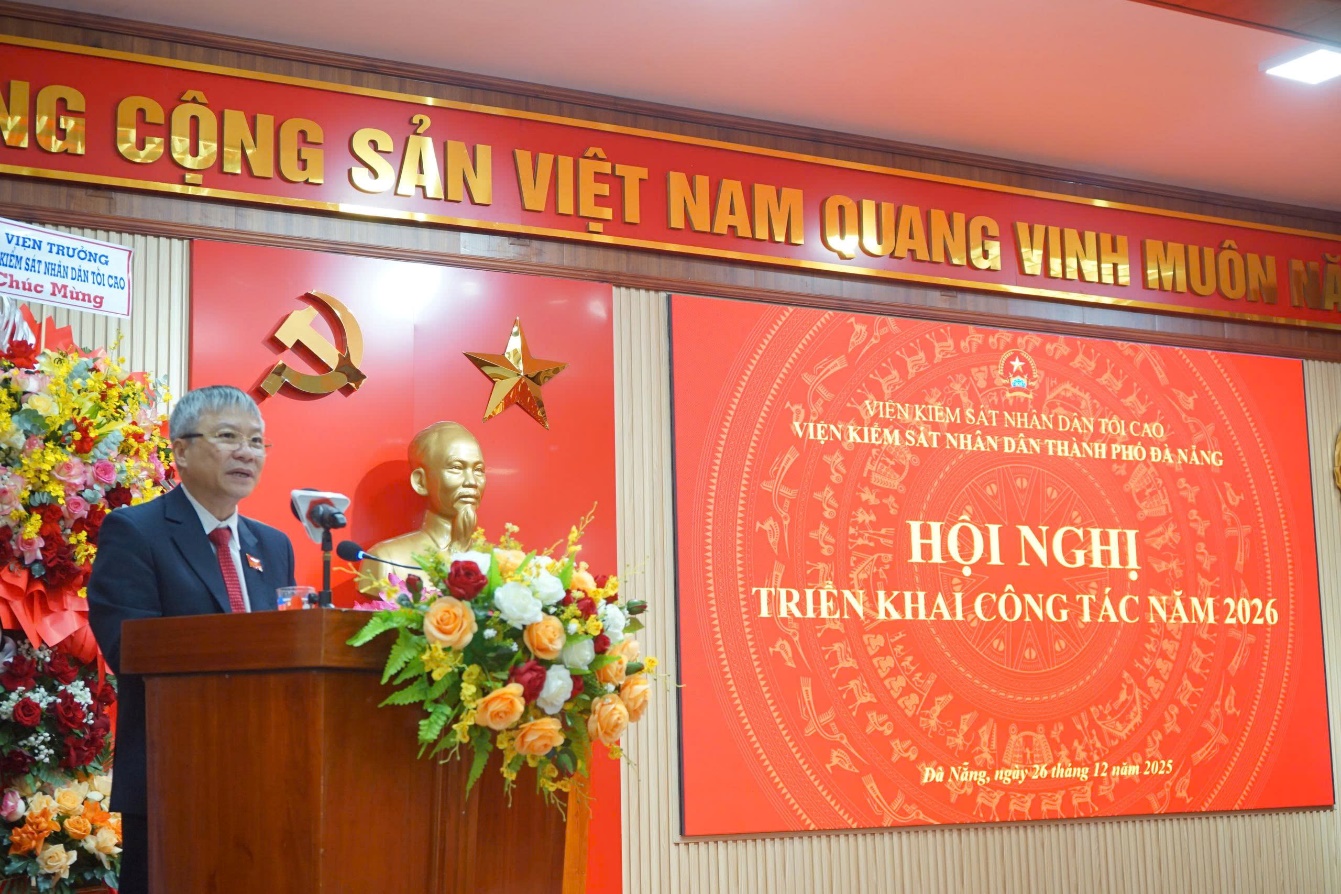 Phát biểu chỉ đạo tại hội nghị, đồng chí Nguyễn Đức Dũng, Phó Bí thư Thành ủy, Chủ tịch HĐND thành phố Đà Nẵng ghi nhận, biểu dương và chúc mừng những kết quả mà ngành Kiểm sát Đà Nẵng đạt được trong năm 2025 đã góp phần quan trọng, trách nhiệm vào việc bảo đảm pháp chế, giữ vững kỷ cương và phục vụ hiệu quả nhiệm vụ phát triển kinh tế - xã hội của thành phố. Đồng chí đề nghị VKSND thành phố tiếp tục tập trung lãnh đạo, chỉ đạo, làm tốt công tác quán triệt các nghị quyết chiến lược, các chỉ thị, kết luận của Trung ương, các đạo luật của Quốc hội, các văn bản lãnh đạo, chỉ đạo của Ngành và của Thành ủy về công tác nội chính, phòng, chống tham nhũng, cải cách tư pháp, nhất là Chỉ thị số 01/CT-VKSTC ngày 10/10/2025 của Viện trưởng VKSND tối cao và Công văn số 509-CV/TU ngày 22/12/2025 của Ban Thường vụ Thành ủy về công tác của VKSND thành phố năm 2026. Tiếp tục duy trì quan hệ phối hợp chặt chẽ với các cơ quan hữu quan, thực hiện nghiêm túc quy định, chỉ đạo của Ban Thường vụ Thành ủy trong xử lý các vụ án, vụ việc thuộc diện Ban Thường vụ Thành ủy và Ban Chỉ đạo phòng, chống tham nhũng, lãng phí, tiêu cực thành phố theo dõi, chỉ đạo. Tăng cường công tác kiểm sát phát hiện các vi phạm, thiếu sót để ban hành kiến nghị, kháng nghị trên tất cả các lĩnh vực nhằm khắc phục kịp thời, triệt để các vi phạm pháp luật và nâng cao hiệu quả công tác phòng ngừa. Chú trọng ứng dụng công nghệ thông tin và chuyển đổi số, nâng cao năng lực số cho đội ngũ cán bộ, Kiểm sát viên, góp phần xây dựng nền tư pháp hiện đại, hiệu quả, gắn với yêu cầu bảo đảm bí mật Nhà nước, an toàn và an ninh mạng. Trong bối cảnh tình hình an ninh chính trị, trật tự an toàn xã hội còn tiềm ẩn nhiều yếu tố phức tạp, yêu cầu đối với các cơ quan bảo vệ pháp luật trong đó có ngành Kiểm sát thành phố phải không ngừng cố gắng nỗ lực, nâng cao năng lực, thực sự là chỗ dựa của công lý, góp phần giữ vững kỷ cương, phép nước, phụng sự Tổ quốc và nhân dân.