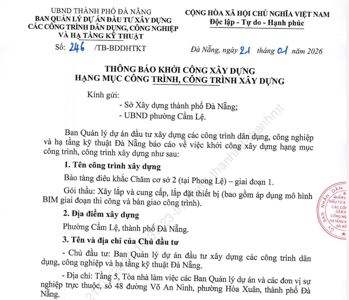 Đáng chú ý, cùng với sự chuyển biến về môi trường, cảnh quan, tiến độ triển khai dự án đầu tư xây dựng, bảo tồn Di chỉ khảo cổ Chăm Phong Lệ cũng đã có bước tiến quan trọng. Ban Quản lý dự án đầu tư xây dựng các công trình dân dụng, công nghiệp và hạ tầng kỹ thuật Đà Nẵng – đơn vị chủ đầu tư – đã ban hành quyết định lựa chọn nhà thầu thi công; công trình chính thức khởi công ngày 04/02/2026, thời gian thi công 360 ngày và dự kiến hoàn thành vào ngày 18/01/2027.