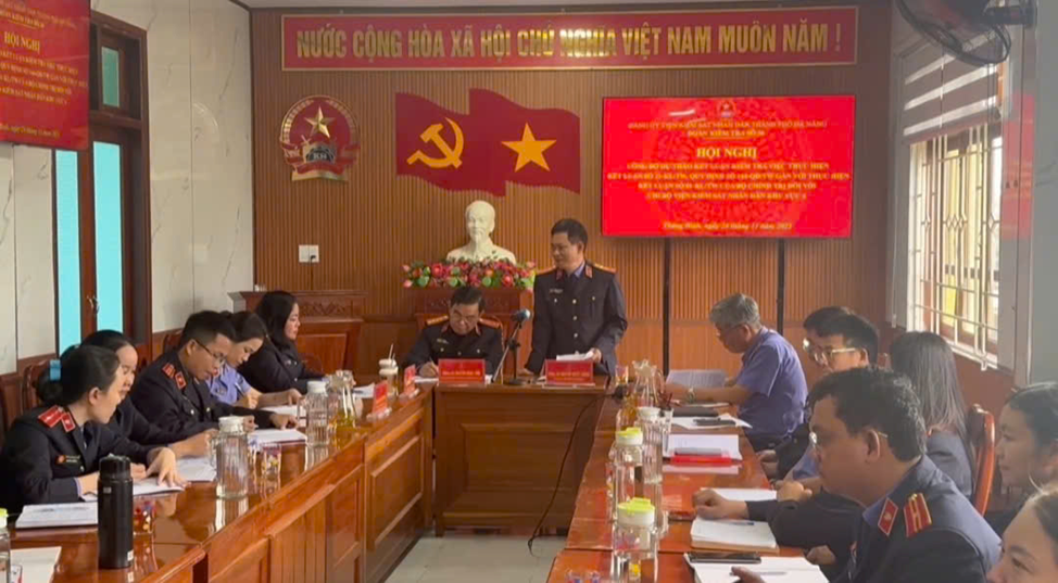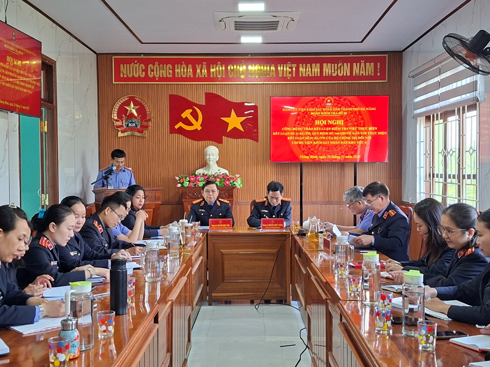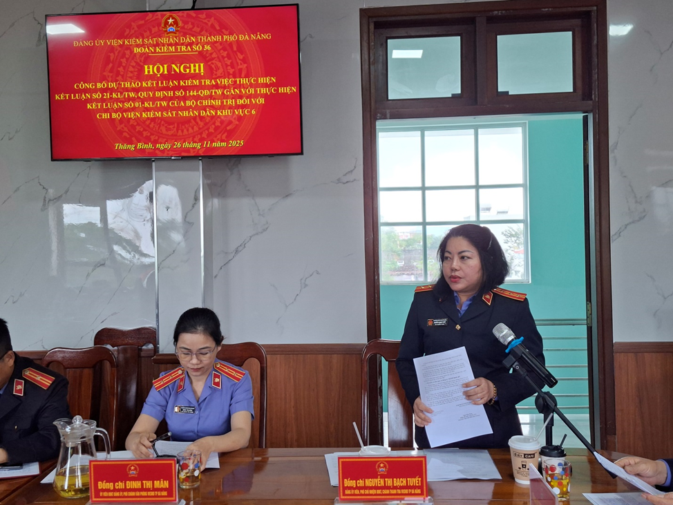Sáng ngày 26/11/2025, Đoàn Kiểm tra số 36 của Đảng uỷ Viện kiểm sát nhân dân thành phố Đà Nẵng công bố dự thảo kết luận kiểm tra việc thực hiện Kết luận số 21-KL/TW ngày 25/10/2021 của Ban Chấp hành Trung ương Đảng khoá XIII về đẩy mạnh xây dựng, chỉnh đốn đảng và hệ thống chính trị; kiên quyết ngăn chặn, đẩy lùi, xử lý nghiêm cán bộ, đảng viên suy thoái về tư tưởng chính trị, đạo đức, lối sống, biểu hiện “tự diễn biến”, “tự chuyển hoá”; Quy định số 144-QĐ/TW ngày 09/5/2024 của Bộ Chính trị về chuẩn mực đạo đức cách mạng của cán bộ, đảng viên trong giai đoạn mới gắn với thưc hiện Kết luận số 01-KL/TW ngày 18/5/2021 của Bộ Chính trị về tiếp tục thực hiện Chỉ thị 05-CT/TW về đẩy mạnh học tập và làm theo tư tưởng, đạo đức, phong cách Hồ Chí Minh tại Chi bộ Viện kiểm sát nhân dân Khu vực 6. Đồng chí Nguyễn Ngọc Tỉnh - Uỷ viên Ban Thường vụ Đảng uỷ, Chủ nhiệm Ủy ban Kiểm tra, Phó Viện trưởng Viện kiểm sát nhân dân thành phố Đà Nẵng, Đại diện Đoàn Kiểm tra số 36 phát biểu chỉ đạo Hội nghị. Tham dự Hội nghị còn có các đồng chí thành viên trong Đoàn Kiểm tra số 36; Chi uỷ Chi bộ, cùng đảng viên Chi bộ Viện kiểm sát nhân dân Khu vực 6.